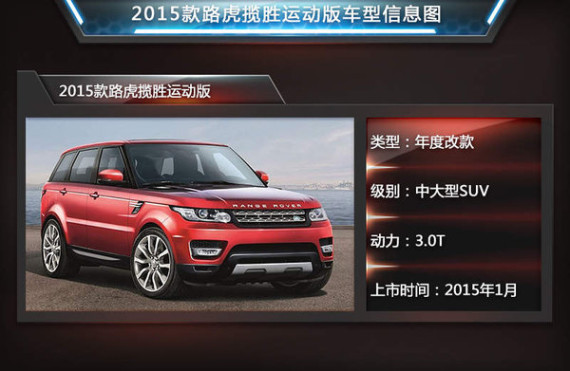 路虎官方在不久前宣布2015款揽胜运动版计划将在2015年1月上市,新车最大的变化是新增了一款搭载3.0L V6柴油发动机和柴油混合动力的车型。据悉,2015款揽胜运动版将会提供7款车型选择,价格区间为98.8-181.8万元。新增的揽胜运动版柴油车型搭载3.0L SDV6发动机,而柴油混合动力版车型由3.0L SDV6发动机和可输出35kW的电动机组成,综合最大输出功率为250kW,峰值扭矩为700Nm,其综合百公里油耗为6.5L/100km。除此之外,其余车型动力系统并没有变化。