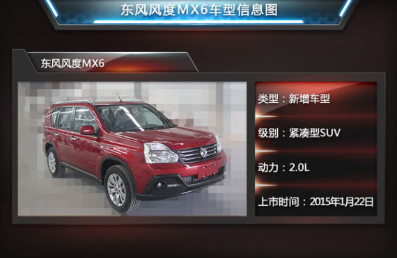 东风风度MX6的外观造型相信大多数人都不会感到陌生,这款基于日产老款奇骏打造的车型,在外观上基本照搬了日产老款奇骏的设计。然而细节方面,风度MX6对比老款奇骏,在前脸部分进行了调整,新车采用三横幅镀铬格栅设计,还对保险杠进行了重新设计。除此之外,在车身后部,后保险杠的样式也有所变化。在车身尺寸方面,东风风度MX6的长宽高依次为4625/1790/1735mm,轴距为2630mm。在动力方面,其将搭载一台2.0L自然吸气发动机,这款发动机的最大功率为106kW。