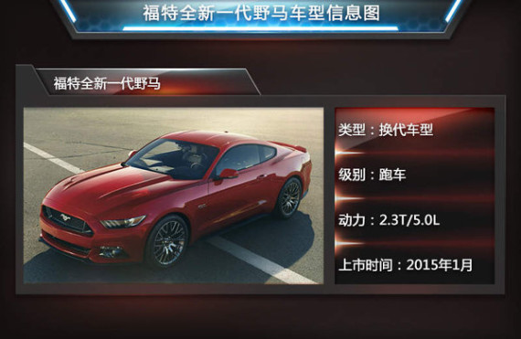 福特全新一代野马采用较长的发动机舱以及经典的鲨鱼嘴造型,车身线条十分流畅。LED日间行车灯排列于格栅两侧,在造型方面与鲨鱼的腮部十分相像。标志性的竖条尾灯,搭配极富层次感的车尾,线条十分硬朗。在动力方面,新车提供2.3T和5.0L V8两款发动机共消费者进行选择,但搭载5.0L V8引擎的车型或不引进国内。两款发动机的最大功率分别为227kW和313kw;峰值扭矩分别达到达到407Nm和529Nm。在传动系统方面,福特全新一代野马配备了6速手动或6速自动变速箱。