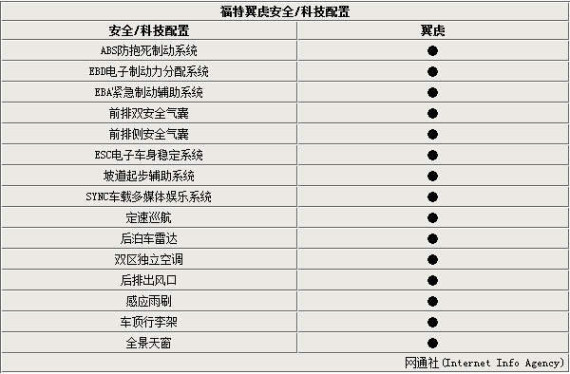 新款翼虎在外观方面基本保持了现款车型的设计,车身尺寸也没有变化,长宽高分别为4524/1838/1695mm(带行李架),轴距为2690mm。新款翼虎全系标配了双区独立空调以及后排出风口等配置,除最低配车型外,其余车型还均配备了感应雨刷、全景天窗、车顶行李架以及SYNC车载多媒体娱乐系统。安全配置方面,新款翼虎标配了前排双安全气囊、前排侧安全气囊、ABS+EBD+EBA、ESC电子车身稳定系统、坡道起步辅助等配置。除最低配车型外,其余车型还配备了定速巡航以及后泊车雷达。