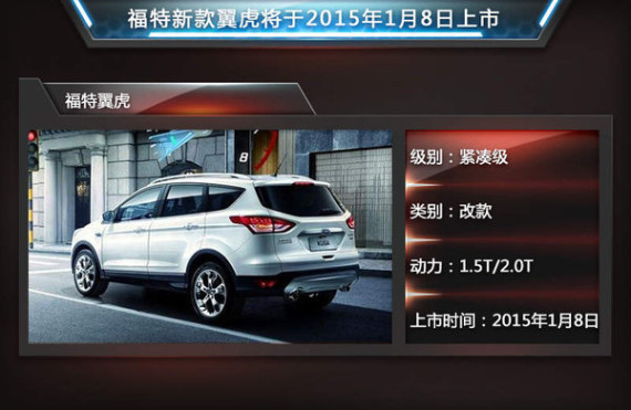 自“1515”战略实施以来,福特不断在国内推出新车型助推销量增长。继12月30日福睿斯上市后之后,福特2015年还将在华推出金牛座、锐界、撼路者等全新车型,现款紧凑级SUV车型翼虎也将迎来改款车型。近日,长安福特官方发布,新款翼虎将于2015年1月8日正式上市,新车将搭载1.5T小排量引擎替代现款车型搭载的1.6T发动机。