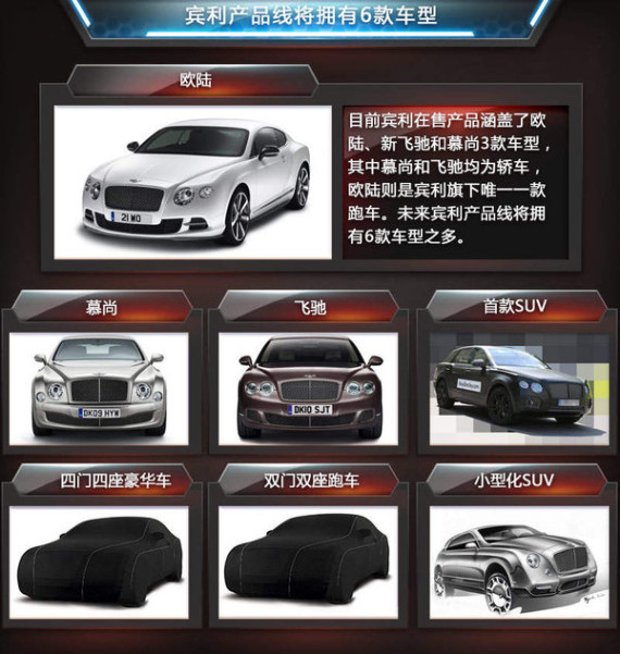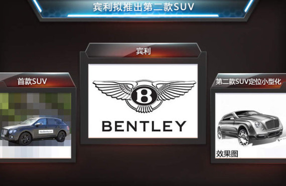 宾利2014年全球总销量为11020辆,同比增长8.9%,再次创下历史新高。中国市场位列美国市场之后,是宾利全球第二大市场,销售了2670辆,销量同比大幅攀升21.9%。为了迎合消费者对于SUV车型的需求,宾利将于今年发布首款SUV产品。近日,欧洲媒体Autocar透露:宾利CEO杜瀚墨(Wolfgang Dürheimer)日前表示,“宾利今年发布首款SUV之后,将着眼于打造更多未来的新车,包括第二款SUV,后者定位于小型化。”