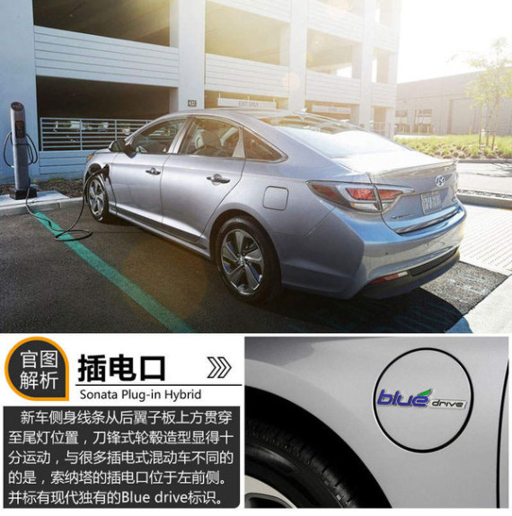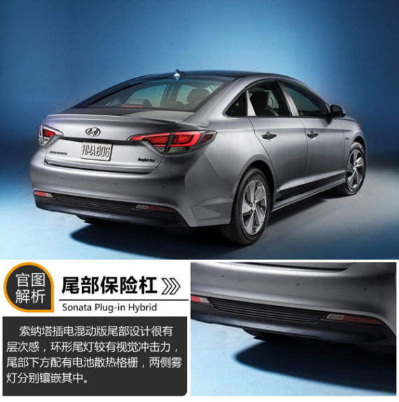 从车身侧面来看,索纳塔插电式混动版的前悬架明显较短,这也使得车身看起来更为修长。此外,新车侧身线条也十分流畅,值得注意的是,该车在翼子板上方标有“Blue drive”标识的插电口,显示出新车的身份,刀锋式铝合金轮毂的金属质感也为整个车身带来更佳的视觉效果。由于车身经过重新设计,尾部造型立体感十足,尤其是其LED尾灯与前大灯遥相呼应,尾翼微翘,与尾灯组搭配十分协调。