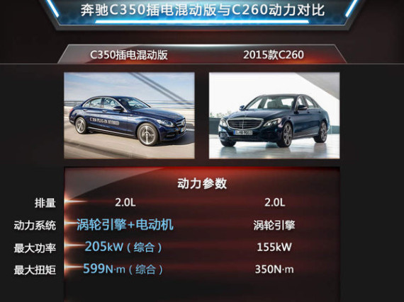 在动力方面,奔驰C350插电混动车型采用由2.0T引擎和电动机组成的混合动力系统,其中发动机的最大功率为155kW,峰值扭矩为350Nm。而电动机的最大功率达到60kW,扭矩则为340Nm。两引擎协同状况下,该车能达到215kW的最大功率以及599Nm的峰值扭矩输出。由于电动机的加入,与搭载相同2.0T引擎的2015款C260相比,新车在最大功率与峰值扭矩这两个数据上分别高出60kW和249Nm。此外在传动系统方面,新车将匹配一款经过全新升级的7速手自一体变速箱。