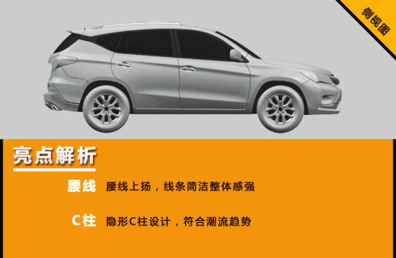 两条凌厉的腰线由翼子板一直上扬至车后门,使得车侧看上去更加简洁,同时增强了整体感。上扬的腰线使得后门车窗的尺寸并不大,隐形的C柱设计使后门车窗与后风挡融合在一起。车顶线条由车头缓缓下沉至车尾,符合时下汽车设计的流行趋势。