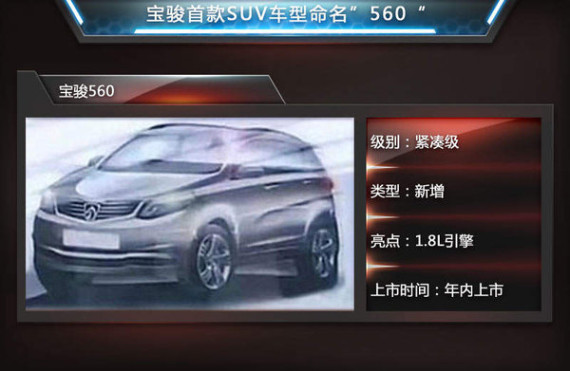 2014年,宝骏依托旗下首款MPV车型实现了高速增长,其中730首月订单成功突破3万辆,成为MPV市场的热销产品。对于宝骏品牌未来的规划,上汽通用五菱内部人士表示:“今后,我们的产品推新速度会大大加快。”未来宝骏将保证每年推出至少一款新产品,以覆盖更多乘用车细分市场,宝骏旗下首款SUV也将于年内正式上市。近日,上汽通用五菱官方透露,宝骏旗下首款SUV命名为560,将主打紧凑级SUV市场。