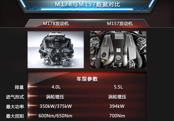 奔驰全新M178 V8发动机有两种调校,低功率可输出350kW的最大功率以及600Nm的最大扭矩,而高功率版拥有375kW最大功率、650Nm最大扭矩。同时奔驰为M178装配了主动式发动机底座、汽缸壁纳米镀层以及交流发电机管理系统等技术。而M157 5.5T V8双涡轮增压发动机的最大功率为394kW、最大扭矩700Nm。虽然在动力参数上有所降低,但是根据欧6排放标准,8缸发动机百公里油耗需控制在8.2升以内,节能减排的同时仍能保证强大的动力输出,这是AMG交出的最好答案。