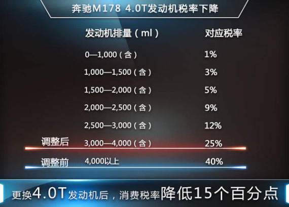 按排量收取的消费税对于搭载大排量发动机的车型的价格来说是致命的,按照奔驰M157 5.5L的消费税计算,其消费税税率高达40%,而换搭M178 4.0T发动机,消费税税率相比前者将下调15个百分点。这15百分点的价格空间对于厂商以及经销商而言十分宝贵,对降低产品的消费门槛以及扩大市场份额均具有推进作用,而消费者可以得到更低的价格AMG。