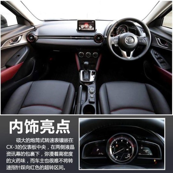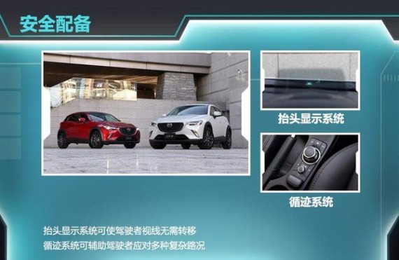 较高的科技含量也是CX-3的一大卖点。新车将搭载新一代接口的HMI、抬头可视系统和定速巡航等。主动安全系统还包括红外线探测,自动刹车,车道偏移预警,以及车侧盲点辅助功能等。