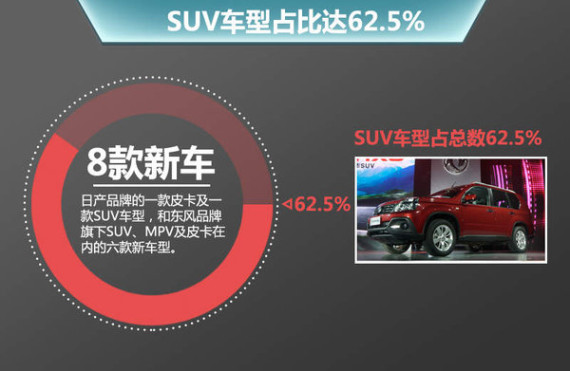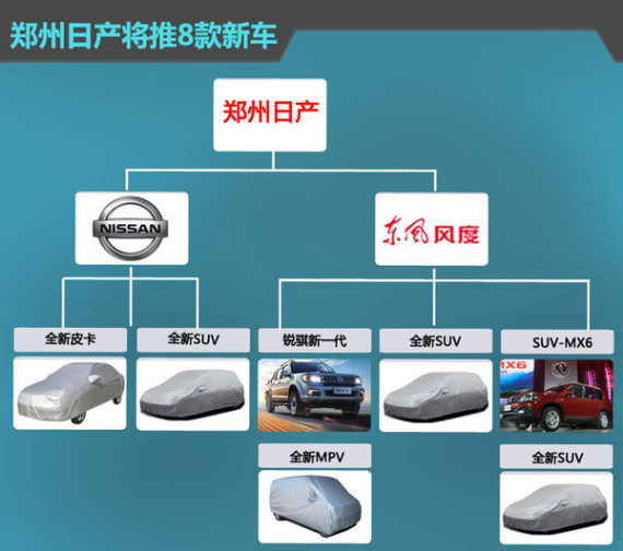 自2015年起,郑州日产的产品布局将进一步完善,基于双品牌下的郑州日产在未来三年共将推出8款新车型,其中包括日产品牌的一款皮卡及一款SUV车型,和东风品牌旗下SUV、MPV及皮卡在内的六款新车型,其中包括全新一代锐骐和MX6。值得一提的是,根据这一数据可以算出,新产品中SUV车型占比超过了60%。