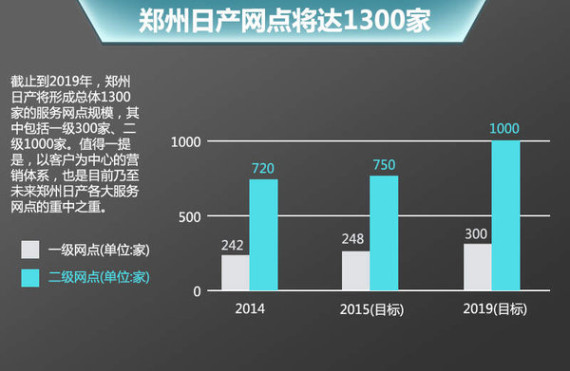 目前,郑州日产拥有一级经销商(包括4S专营店、展厅等)242家,二级经销商720家,形成了集整车销售、配件销售、信息反馈、售后服务为一体的、行之有效的销售服务网络。面对一系列新车的推出,服务网点的增加也是郑州日产未来的重点工作之一。官方表示,截止到2019年,郑州日产将形成总体1300家的服务网点规模,其中包括一级300家、二级1000家。值得一提是,以客户为中心的营销体系,也是目前乃至未来郑州日产各大服务网点的重中之重。