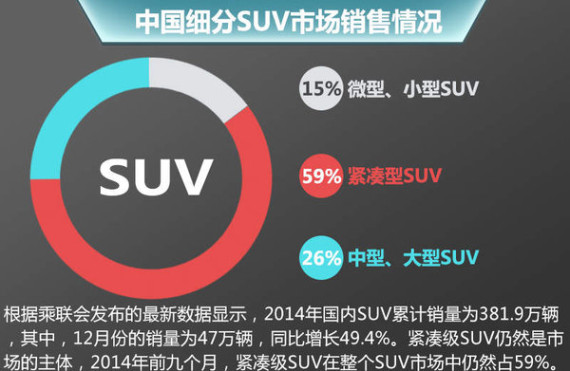 根据乘联会发布的最新数据显示,2014年国内SUV累计销量为381.9万辆,其中,12月份的销量为47万辆,同比增长49.4%。紧凑级SUV仍然是市场的主体,2014年前九个月,紧凑级SUV在整个SUV市场中仍然占59%。讴歌RDX是一款紧凑级SUV车型,凭借个性的外观、出众的动力与性能、宽敞的内部空间和卓越的安全性,RDX被消费者喻为“恰到好处”的SUV,备受年轻豪华车消费者的关注。