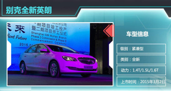 通用汽车2014年在最大单一市场中国取得354万辆销量成绩,2015年将继续推进新车攻势,促进在华销量销量进一步攀升。通用汽车中国公司总裁钱惠康此前曾表示:“2015年通用将会在市场上投放更新的和改型的车子,目前统计包括五菱、宝骏、别克、雪佛兰、凯迪拉克在内大约会有12款新车型在今年问世。”其中别克旗下重要走量车型英朗将推出全新产品,3月2日正式上市。媒体近日获得了一组全新英朗实车图片,新车在外观设计方面改动明显,还将换搭1.4T/1.5L两款小排量引擎。