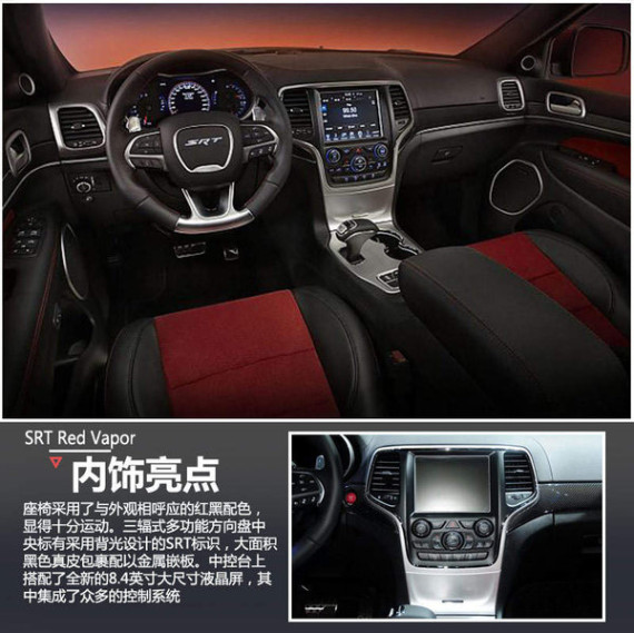 内饰上,座椅采用了与外观相呼应的红黑配色,显得十分运动。三辐式多功能方向盘中央标有采用背光设计的SRT标识,大面积黑色真皮包裹配以金属嵌板。中控台上搭配了全新的8.4英寸大尺寸液晶屏,其中集成了众多的控制系统:包括集成导航、通讯、娱乐以及车内温度控制等。此外还标配了自适应可变阻尼减震和带有主动降噪功能的音响系统。
