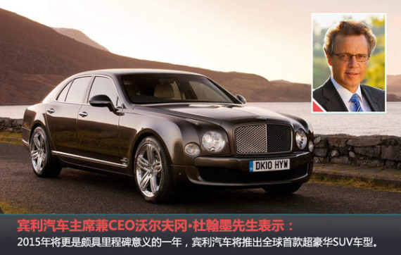 今年9月,宾利将率先推出旗下首款SUV车型Bentayga,抢占顶级豪华SUV这一细分市场的先机。对此,宾利汽车主席兼首席执行官沃尔夫冈•杜翰墨(Wolfgang Dürheimer)先生表示:2015年将更是颇具里程碑意义的一年,宾利汽车将推出全球首款超豪华SUV车型。Bentayga基于大众的MLB Evo平台开发,家族特征依旧浓厚。新车将会提供多款动力。鉴于中国是宾利最重要的市场之一,且近年来宾利新车推出后均同步入华,今年这款全新SUV也将有望同步入华销售。
