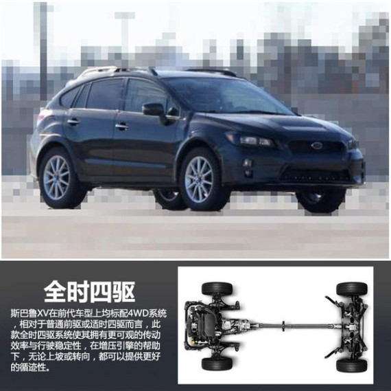 斯巴鲁XV在现款车型上均标配4WD系统,相对于普通前驱或适时四驱而言,此款全时四驱系统使其拥有更可观的传动效率与行驶稳定性,在增压引擎的帮助下,无论上坡或转向,都可以提供更好的循迹性。全新XV车型也将延续现款的四驱系统。