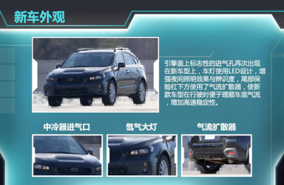 新款XV在外观设计上与现款相似,最大亮点为引擎盖,虽然斯巴鲁坚持使用顶置中冷器,但考虑到气动布局,因此舍去了引擎盖上标志性的进气孔,仅用一根导风管从进气格栅引向中冷器。但在此次亮相的谍装车上却再次看到了这一象征标记。车灯使用LED设计,后视镜集成转向灯,值得一提的是新车的离地间隙很大,在接近角不大的情况下也可以做一些轻度越野,在车顶行李架的点缀下,使其看起来比现款XV更具硬汉范儿。