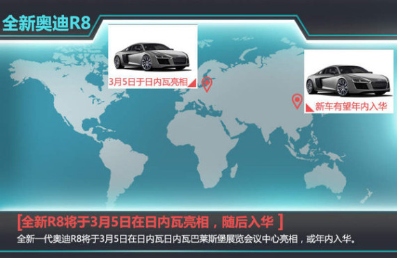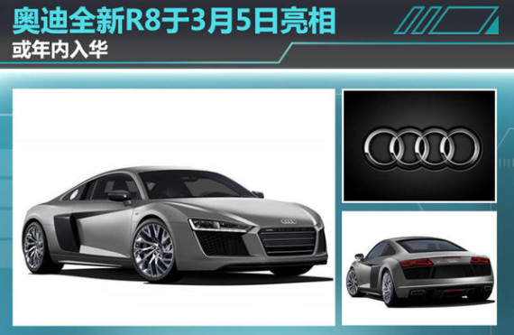 目前奥迪品牌已经实现了全系车型在国内市场的覆盖,而伴随着大众集团全新平台的使用,奥迪将进一步扩充产品布局并对部分产品进行更新,其中奥迪超级跑车R8也将在更新范围之内。近日,奥迪内部人士透露:全新一代奥迪R8将于3月5日正式亮相,随后有望年内入华。新车不仅更新了产品动力布局,在外观、内饰方面也进行了全新设计。