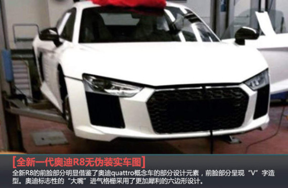 全新一代奥迪R8基本延续了现款车型的造型设计,不过在细节方面修改使得新车呈现出更加锐利的气质。全新R8的前脸部分明显借鉴奥迪quattro概念车的部分设计元素,前脸部分呈现“V”字造型。奥迪标志性的“大嘴”进气格栅采用了更加犀利的六边形设计,为配合全新的进气格栅,大灯造型也采用了与全新TT一样的楔形设计。