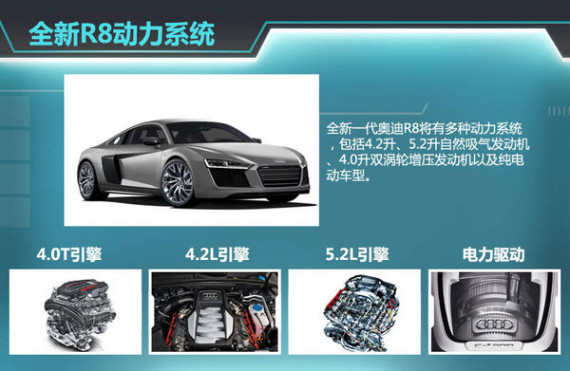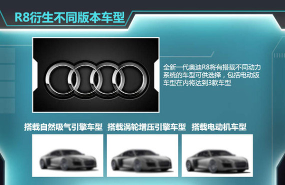 动力方面,奥迪将对R8的动力系统进行重新布局,现款车型搭载了4.2L和5.2L两款自然吸气发动机,而全新一代R8除将搭载重新调教过的4.2L和5.2L自然吸气发动机外,还将搭载一台4.0L V8双涡轮增压发动机。传动方面,与发动机匹配的或将是7速双离合变速箱,quattro四驱系统仍将是标配。除此之外,奥迪还将推出R8电动版车型,对此,奥迪研发与工程业务新负责人乌里奇·哈肯伯格表示:“R8 e-tron还是要继续做下去,现在续航里程已经从原来的200公里提到了440公里。”预计新车量产后续航量程将达到500公里左右。