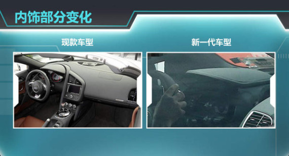 内饰部分,全新一代R8将有很大变化,现款车型夸张的不规则造型中控台将会有所收敛,仪表盘部分的将独立于中控台,而全新的TFT全液晶仪表盘也将取代现款车型搭载的机械式仪表盘,车辆和娱乐信息都可在这块屏幕上显示,整体造型风格向2015款奥迪TT靠拢。