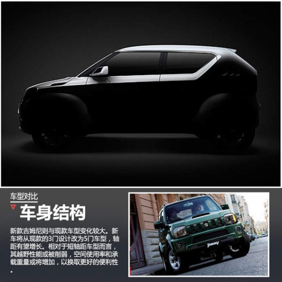 即将发布的紧凑轿车为两厢轿车结构,该款新车使用了双腰线设计,从车头向车尾方向上扬,且在前车窗处采用下弧线造型,使驾驶者视线更宽阔,一定程度上增加了行驶安全。而新款吉姆尼则与现款车型变化较大。新车将从现款的3门设计改为5门车型,轴距有望增长。相对于短轴距车型而言,其越野性能或被削弱,空间使用率和承载重量或将增加,以换取更好的便利性。