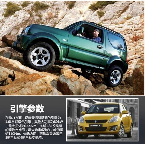 在动力方面,现款天语所搭载的引擎为1.6L自然吸气引擎,其最大功率为80kW,最大扭矩为144Nm。搭载1.3L发动机的现款吉姆尼,最大功率62kW,峰值扭矩110Nm。传动方面,两款车型均采用5速手动或4速自动变速箱。