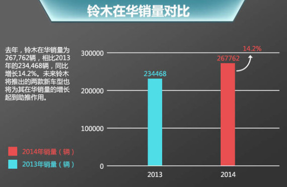 去年,铃木在华销量为267,762辆,相比2013年的234,468辆,同比增长14.2%。未来铃木将推出的两款新车型也将为其在华销量的增长起到助推作用。