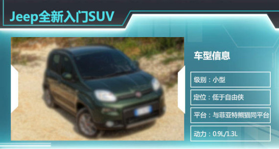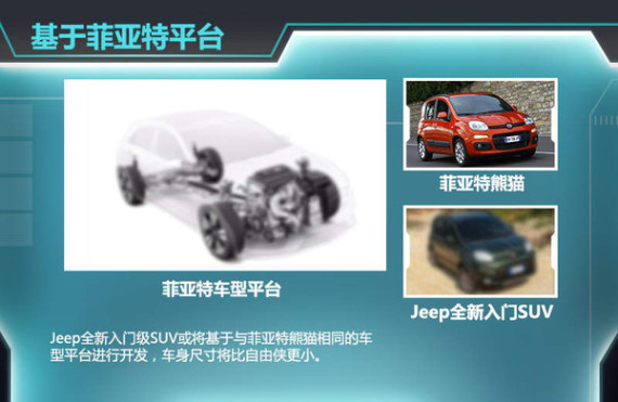 克莱斯勒与菲亚特此前已完全合并,双方共享车型平台及动力总成进行产品开发已日趋常态化,现款Jeep自由侠正是基于与菲亚特500X相同的SCCS车型平台打造。据悉Jeep全新入门级SUV或将基于与菲亚特熊猫相同的mini车型平台进行开发,车身尺寸将比自由侠更小,竞争对手将锁定铃木吉姆尼等同级别车型。
