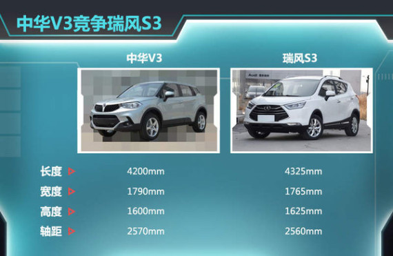 按照华晨中华的规划, 瞄准小型SUV市场,中华V3定位为A0级SUV。据了解,中华V3的长宽高分别为4200/1790/1600mm,轴距则达到了2570mm。根据中华V3的市场定位,将与同级市场内热销的瑞风S3形成直接竞争关系。与瑞风S3相比,中华V3拥更宽的车身尺寸,轴距也更加出色,有助于车内乘坐空间的表现。