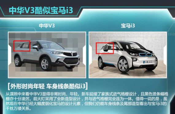 从谍照中来看中华V3显得非常时尚、年轻。新车延续了家族式进气格栅设计,引入了镀铬饰条,造型也进行了调整,更加突出“T”型元素,且黑色竖条幅格栅亦十分凌厉。前大灯采用了全新造型设计,并与进气格栅完全连为一体,前保险杠下方加入了黑色防擦板,更有跨界味,整体造型极具层次感。值得一提的是,虽然中华V3已经大幅度弱化宝马的设计元素,但我们仍能车身线条及尾部造型看出与宝马i3的千丝万缕关系。