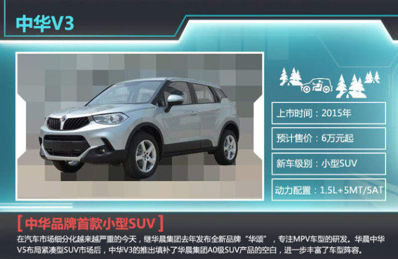 中华V3适时切入现阶段火热的小型SUV市场,外形设计上比较有看点,采用了不少时尚的元素。但若想在小型SUV的细分市场中占有一席之地,产品的定价对销量也有着关键性的作用。据内部人士透露:中华V3的起售价预计为6万元,与同级别其他车型相比具有一定优势。时尚的外观,不错的动力组合,合理的定价,中华V3的市场前景光明,为小型SUV市场再添一把火。
