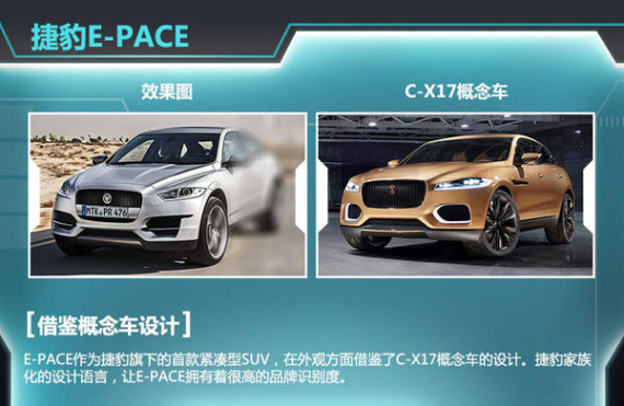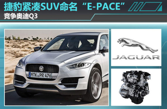捷豹在不久前发布的官方消息表明,该品牌将在2016年推出定位为跑车型运动SUV的捷豹F-PACE。这款车型的公布,预示着捷豹品牌正式进军豪华SUV领域。近日,德国媒体autobild报道称:捷豹将推首款紧凑型SUV,与时下热门的奥迪Q3等车型展开激烈竞争。媒体从国家工商总局了解到,捷豹路虎有限公司注册了E-PACE、F-PACE等全新商标。这表明除F-PACE外,捷豹还将推出一款命名为“E-PACE”的全新车型。根据捷豹目前的命名习惯,E-PACE即为定位略低于F-PACE的紧凑型SUV。