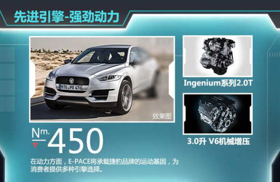 在动力方面,E-PACE将承载捷豹品牌的运动基因,提供多种引擎选择。其中捷豹最新研发的Ingenium系列2.0T四缸发动机的摩擦系数较此前捷豹车型所搭载来自福特的2.0T引擎大幅降低,在同类别中称得上是最为高效的2.0T引擎。更强动力的车型上有望采用源于捷豹F-TYPE的3.0升 V6机械增压引擎,最大功率为250kW,峰值扭矩450Nm。传动方面,新车将搭载ZF 8速手自一体变速箱。