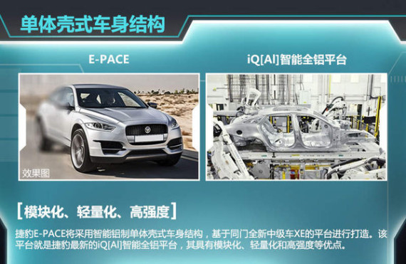 除了外观上的品牌特质,捷豹E-PACE将采用智能铝制单体壳式车身结构,基于同门全新中级车XE的平台进行打造。该平台就是捷豹最新的iQ[Al]智能全铝平台,其具有模块化、轻量化和高强度等优点。相比目前捷豹XJ等车型使用的全铝车身,模块化全铝架构使用更高密度的全铝材质。捷豹技术专家Mark White博士表示:“这意味着超轻车身重量、高强度和抗扭性能。”另外,此平台的双叉臂前悬、电动转向等技术的应用,也将使捷豹E-PACE更适用于公路驾驶。