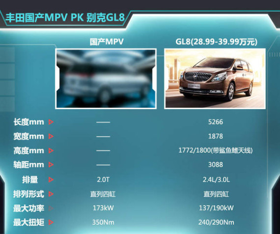 在当前大型MPV市场中,别克GL8以其优异的市场表现堪称代表车型,该车售价区间为28.99-39.99万元,轴距达到3088mm,动力上配备的是2.4L和3.0L两款自然吸气直喷引擎。丰田国产MPV搭载2.0T引擎后,动力输出正好在GL8 2.4L与3.0L之间,两车在定位上也处于相同级别,待丰田国产MPV推出之后,势必将对GL8市场份额产生一定冲击。