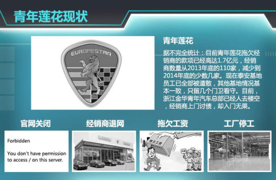 据不完全统计:目前青年莲花拖欠经销商的款项已经高达1.7亿元,经销商数量从2013年底的110家,减少到2014年底的少数几家。现在泰安基地员工已全部被遣散,其他基地情况基本一致,只留几个门卫看守。目前,浙江金华青年汽车总部已经人去楼空,只留下少许保安人员及业务人员留守,经销商上门讨债,却入门无果。