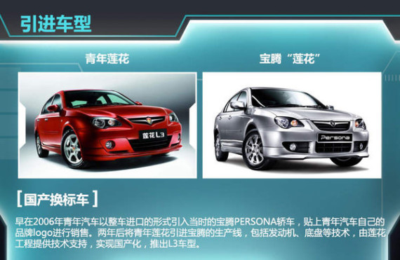 早在2006年青年汽车以整车进口的形式引入当时的宝腾PERSONA轿车,贴上青年汽车自己的品牌logo进行销售。两年后将青年莲花引进宝腾的生产线,包括发动机、底盘等技术,由莲花工程提供技术支持,实现国产化,推出L3车型。