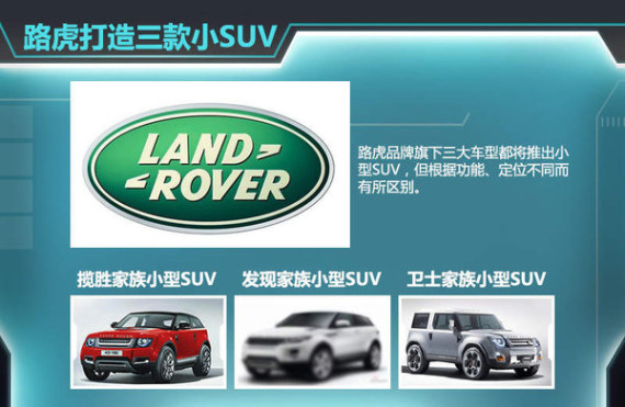 捷豹路虎2014年全球销量同比增长8.9%,达到46.3万辆,其中路虎品牌去年占据集团总销量的82.4%份额。捷豹路虎计划未来将推出更多全新车型以进一步提升全球销量,对此捷豹路虎负责营销业务的董事Andy Goss表示:“2017年(捷豹路虎)有望达到德系豪车竞争对手中最小者(梅赛德斯-奔驰)的一半。”路虎官方发布:路虎品牌未来将进军小型车市场,推出三款小型SUV车型。在路虎品牌下,未来将形成高端的路虎揽胜家族;中端的路虎发现家族以及专业级的路虎卫士三个系列,这三款小型SUV将分别来自以上三个家族。