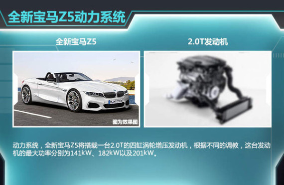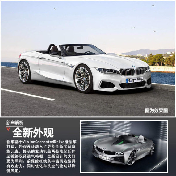 全新宝马Z5有望作为Z4的继任者推出,该车是由宝马与丰田合作研发。丰田曾于去年11月透露与宝马讨论合作研发全新Z5技术上的可行性并取得成功,目前该计划已进入概念车阶段。这款新一代的宝马Z5将基于去年发布的Vision Connected Drive概念车研发,新车预计采用软顶敞篷设计,在车身材料方面将借鉴i3与i8的碳纤维车身技术并搭载一台2.0T涡轮增压发动机。