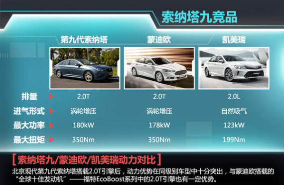 从目前国内市场中的同级别车型来看,第九代索纳塔推出之后,主要的竞争对手为主打家用且偏运动风格的丰田凯美瑞以及蒙迪欧等车型,搭载2.0T引擎后的第九代索纳塔,动力优势在同级别车型中十分突出,就算与蒙迪欧搭载的“全球十佳发动机”——福特EcoBoost系列中的2.0T引擎相比,也有一定优势。