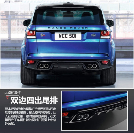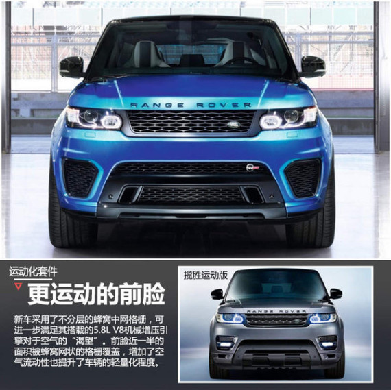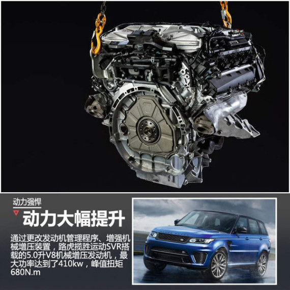 新车最大的亮点就是动力部分得到了提升,通过更改发动机管理程序、增强机械增压装置,路虎揽胜运动SVR搭载的5.0升V8机械增压发动机,最大功率达到了410kw,峰值扭矩680N.m,相比普通版的揽胜运动版最大功率增加37马力,峰值扭矩增加55N.m。传动方面,与发动机匹配的是8速手自一体变速箱,此外新车还搭载四驱系统。