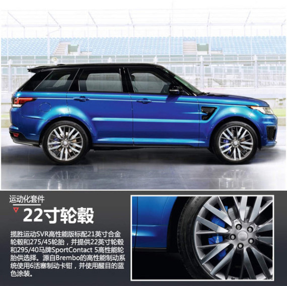 原本揽胜运动版的运动气息就很浓烈,在换装了更加激进的侧裙、造型和面积更夸张的发动机侧进气口后,整个车辆显的速度感急剧提升。另外重点要说的是,揽胜运动SVR高性能版标配21英寸合金轮毂和275/45轮胎,并提供22英寸轮毂和295/40马牌SportContact 5高性能轮胎供选择。源自Brembo的高性能制动系统使用6活塞制动卡钳,并使用醒目的蓝色涂装。