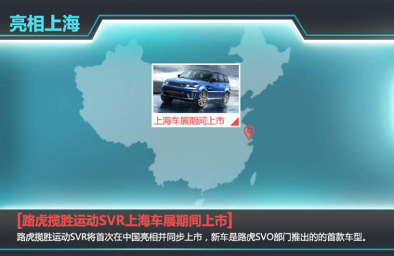 捷豹路虎去年在英国成立了Special Vehicle Operations部门(以下简称SVO),专门为高端客户提供高级定制和生产高性能车型。在随后举办的圆石滩车展上,该部门推出了首款高性能SUV--路虎揽胜运动 (配置|询价)SVR。对此,捷豹路虎SVO部门老板John Edwards称,路虎揽胜运动版SVR是该系列的第一款车型,随后还将推出更多SVR版本车型。近日,路虎内部人士透露,路虎揽胜运动SVR将于今年四月在上海车展期间上市。路虎揽胜SVR堪称史上速度最快的路虎车型,百公里加速时间仅为4.5秒,极速被限定在260km/h。