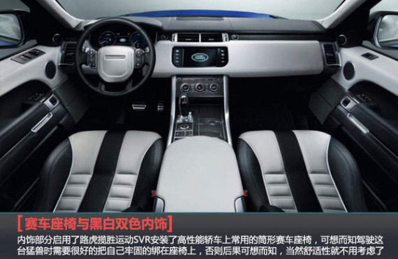 内饰部分的变化不是很大,但是路虎揽胜运动SVR安装了高性能轿车上常用的筒形赛车座椅,可想而知驾驶这台猛兽时需要很好的把自己牢固的绑在座椅上,否则后果可想而知,当然舒适性就不用考虑了。另外,黑白双色搭配的也恰到好处,沉稳又运动。