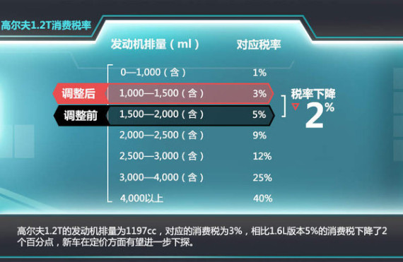 现款高尔夫搭载的1.6L引擎在车价当中税率部分包括了5%的消费税 、17%的增值税。“消费税”由生产企业或是进口汽车企业向税务机关缴纳,但最终会体现在车价当中。在换装更小排量的1.2T引擎之后对应税率仅为3%,小幅下调了2个百分点。新车在定价方面有望进一步下探,有助于新车销量的提升。此外,随着动力及燃油经济性更佳的1.2T发动机出现,1.6L自然吸气发动机有望淡出市场被1.2T取代,大众产品将全面进入涡轮时代。