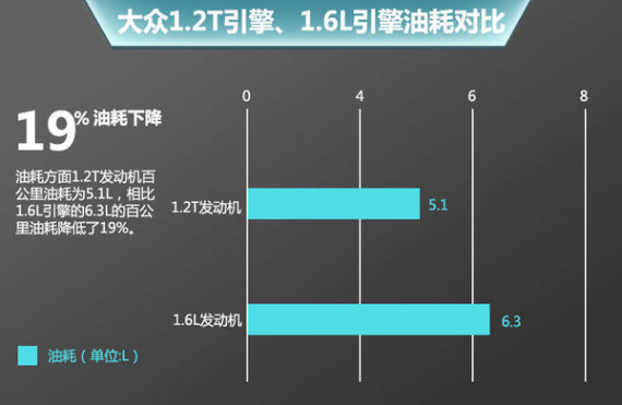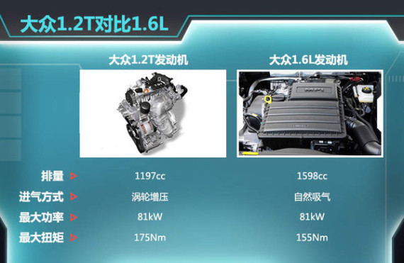 这款新车所搭载的是一台EA211系列1.2T涡轮增压发动机,采用全铝合金缸体,该引擎最大输出功率为81kW、峰值扭矩为175Nm,与之匹配的是一台7速DSG双离合变速箱。新发动机与1.6L自然吸气发动机的输出功率同为81kW,但最大扭矩多出20Nm;油耗方面1.2T发动机百公里油耗为5.1L,相比1.6L引擎的6.3L的百公里油耗降低了19%。新车在动力性能以及燃油经济性上较1.6L自然吸气版本均有所提升。