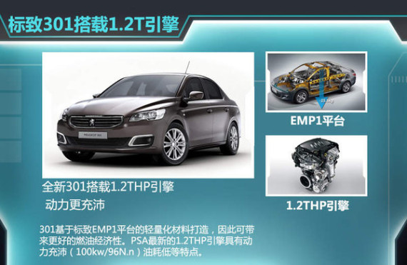 东风标致301是标致首款在华基于EMP1平台打造的车型,该平台所产车型的关键部分零件采用了轻量化材料打造,从而使车辆获得了更好的经济性和性能表现。除了外观方面的升级,东风标致301也会推出动力更强的搭载1.2THP涡轮增压发动机的车型。虽然这是一台三缸发动机,但是却集成了PSA集团众多最新技术,例如小贯量涡轮、缸内支配、全铝机体、DOHC等先进技术,由此这台小排量引擎带来了100kw的最大功率,峰值扭矩也达到了230N.m。