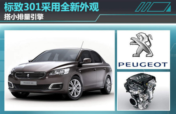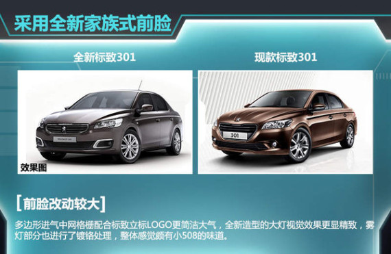 中期改款标致301对外观方面进行了全面升级,新车采用了标致家族最新风格的前脸造型,相比现款车型更加刚毅、简洁。进气格栅的镀铬条不在把前保险杠也包括进来,并且造型也一改往日的圆滑风格,看起来似乎中网面积缩小一半,实际大小并没有改变。新车灯源依然采用卤素灯泡,但是却采用了标致家族最新的鹰眼造型,看起来犀利了许多,雾灯位置也加入了镀铬装饰处理。整体看来,新车与标致旗舰级轿车508有几分相似的味道,预计国产301车型将与海外车型同步推出改款车型。