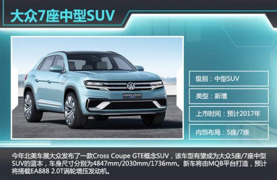 大众的SUV产品目前仅有途观与途锐两款,途观销量持续走高而途锐专攻高端路线,大众SUV产品仍有空白有待填补。今年北美车展,大众品牌发布了一款Cross Coupe GTE概念SUV,该车型有望成为大众5座/7座中型SUV的蓝本,车身尺寸分别为4847mm/2030mm/1736mm。这款概念车外观设计采用全新大众家族元素,动力系统由2.0T发动机与两台电动机构成,综合功率为264kW。而全新大众中型SUV将由MQB平台打造,预计将搭载EA888 2.0T涡轮增压发动机。